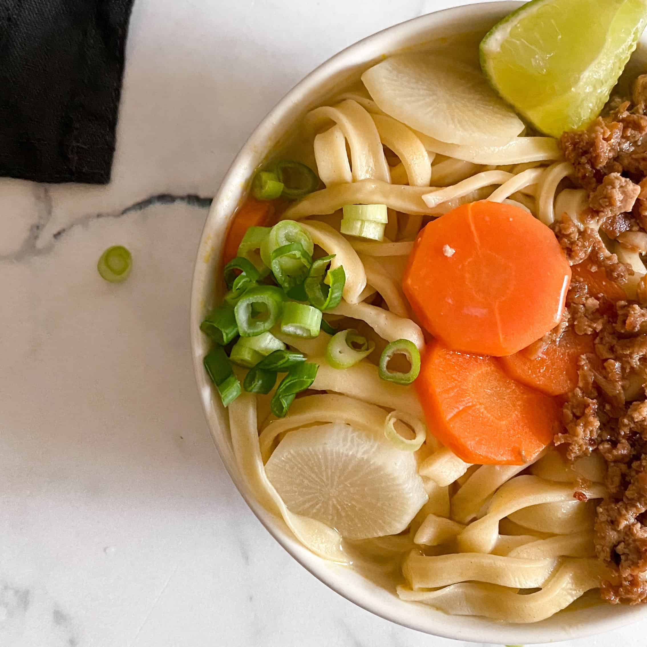 מגישים בקערה, מניחים רק את הנודלס והירקות, מניחים 2 כפות גדושות של הטופינג, ממלאים במרק מהסיר עד סוף הקערה, מניחים בצל ירוק וליים בקערה.