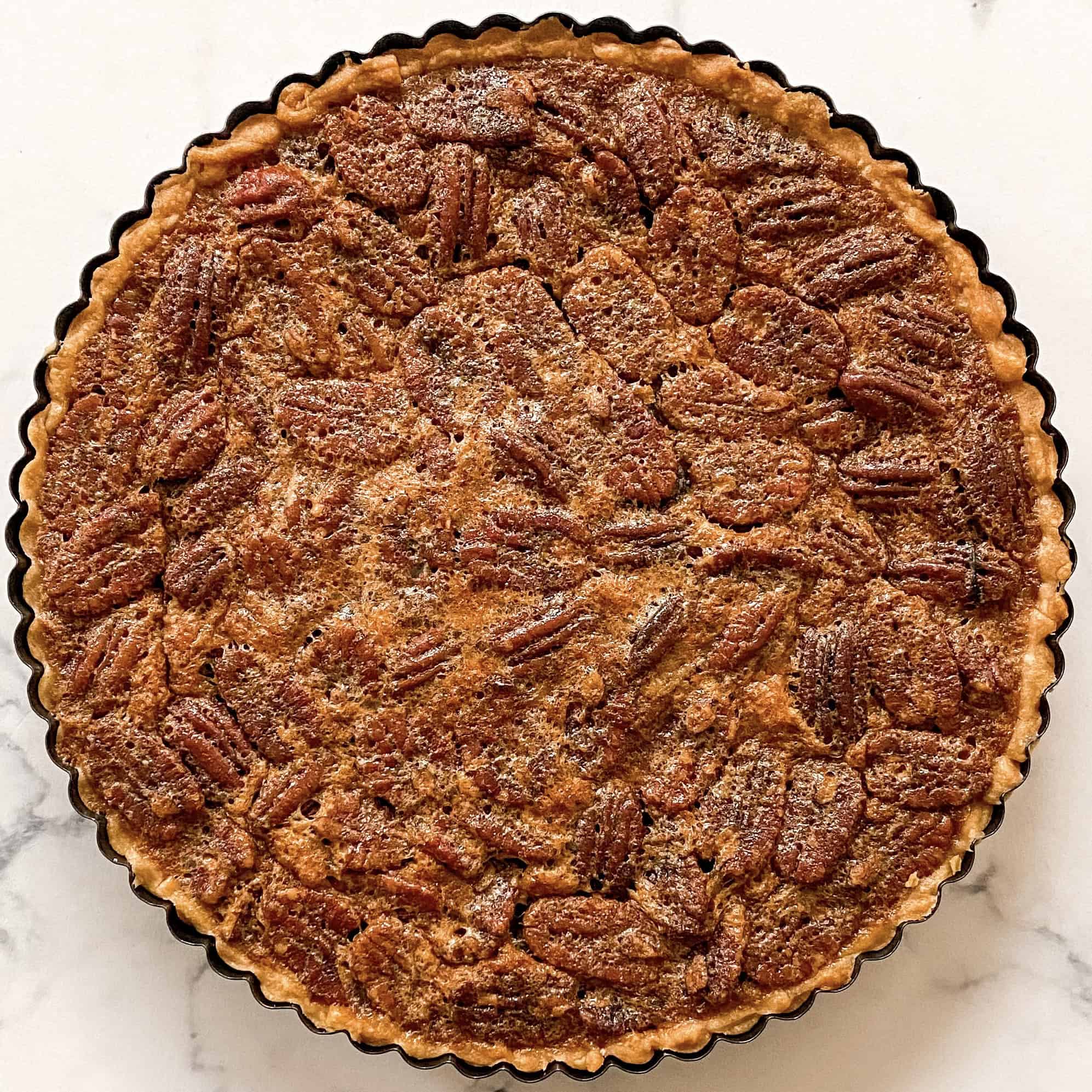 שופכים את הבלילה על הפקאן, מנערים במעט להוצאות בועות אוויר ומכניסים לתנור למשך 50 דק׳.