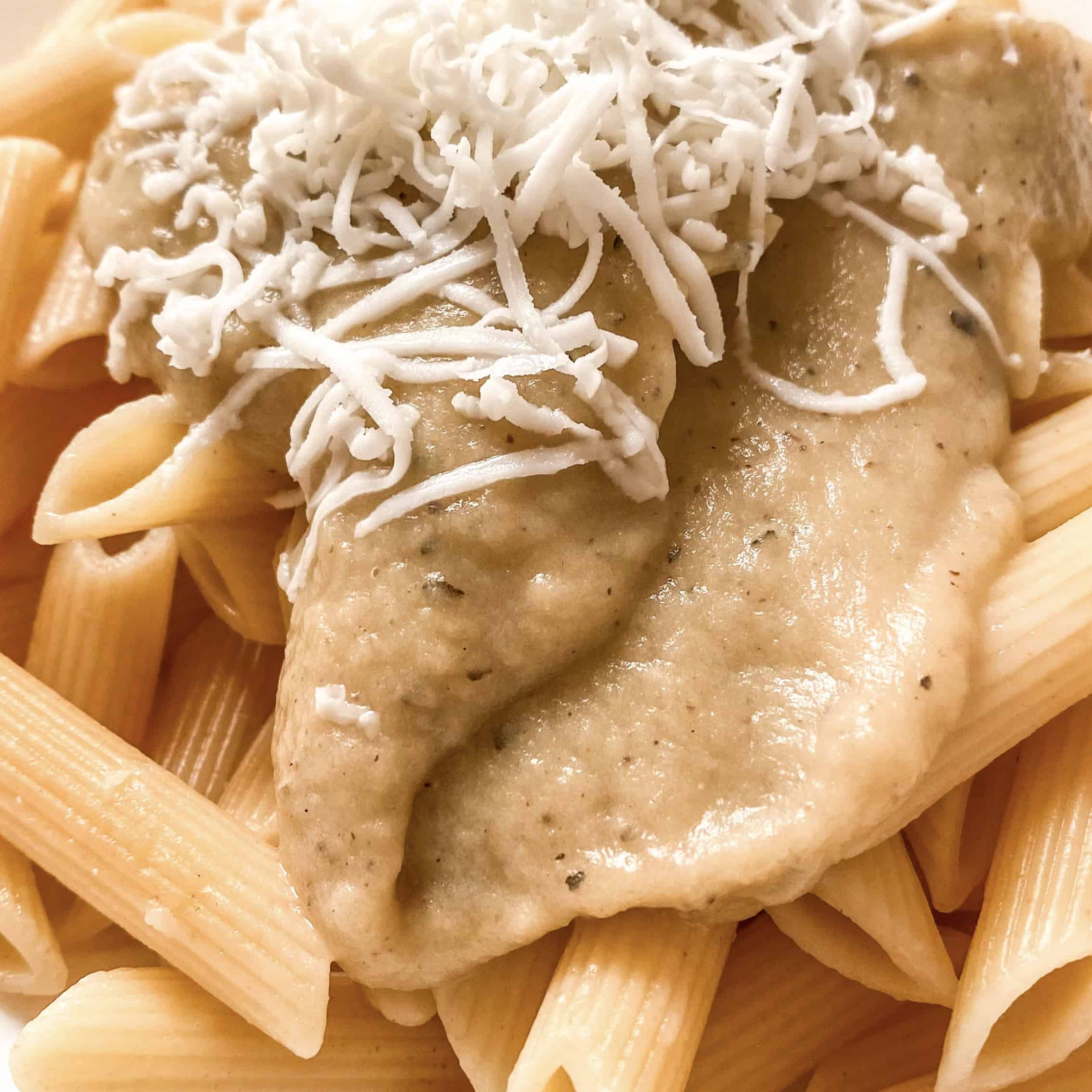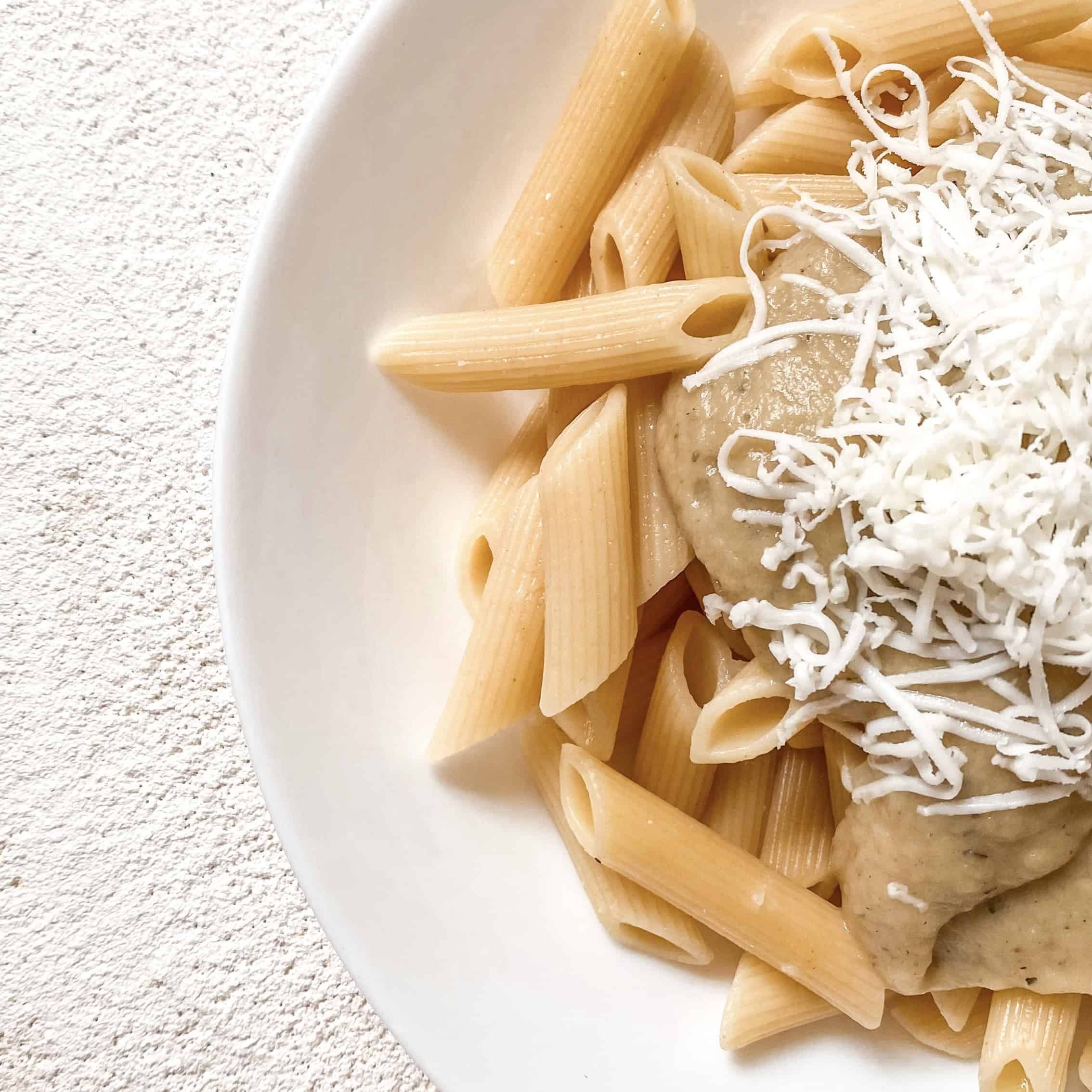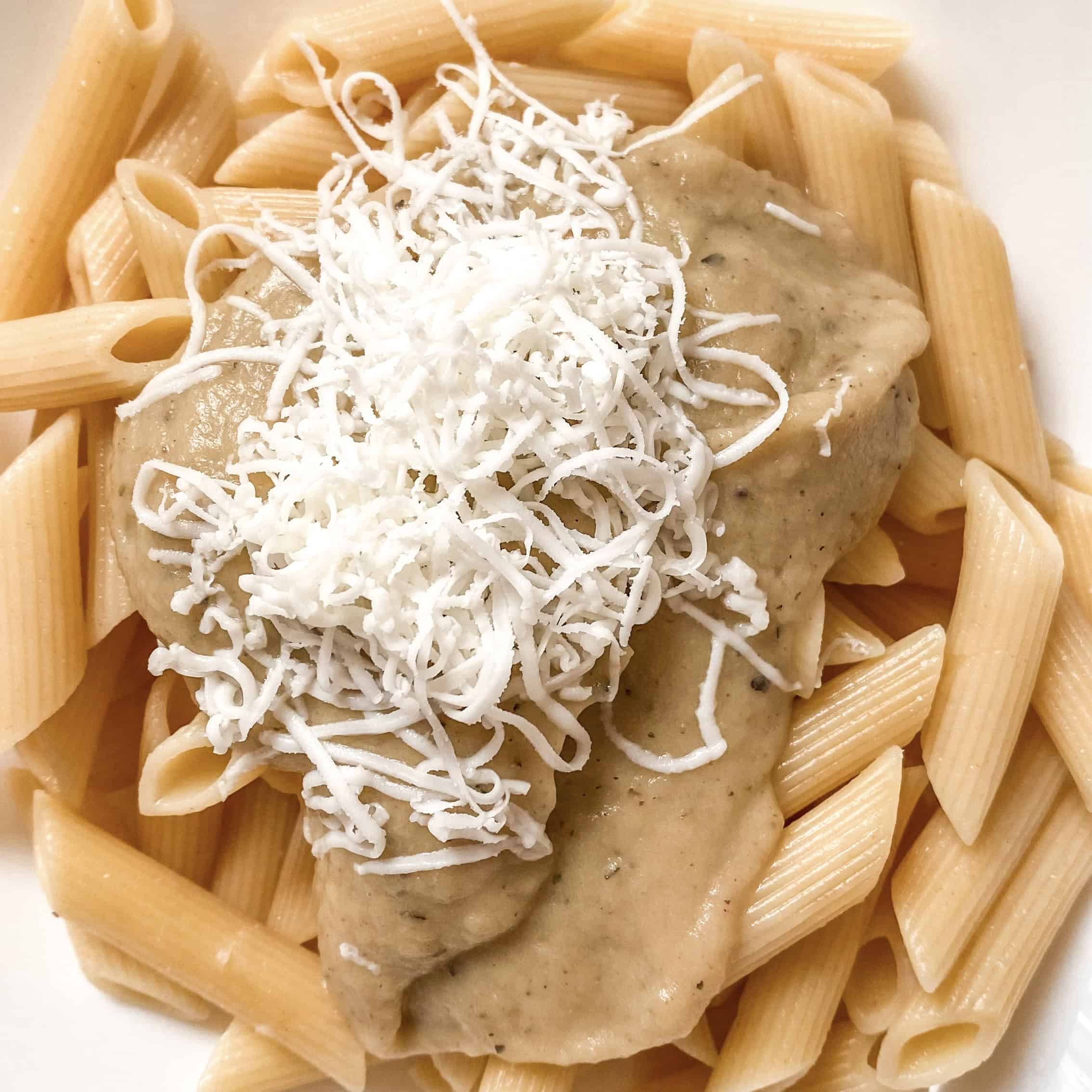 שופכים את הרוטב בנדיבות על פסטה שהורתחה מראש ומגרדים גבינת חמד בנדיבות.