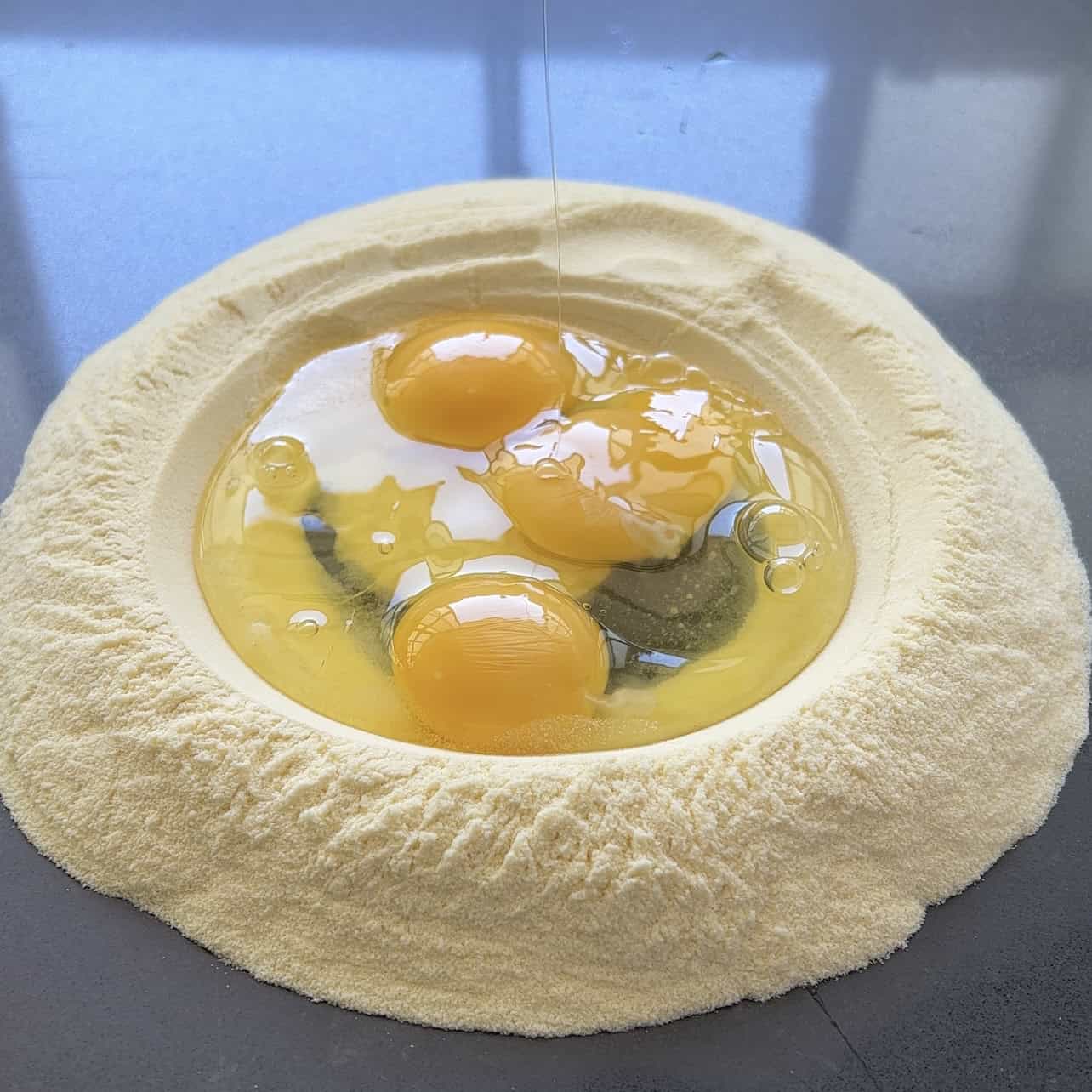 ניצור גומה מהקמח, נשבור פנימה את הביצים והמלח (ניתן לקשקש את הביצים והמלח לפני כן ורק אז לשפוך)