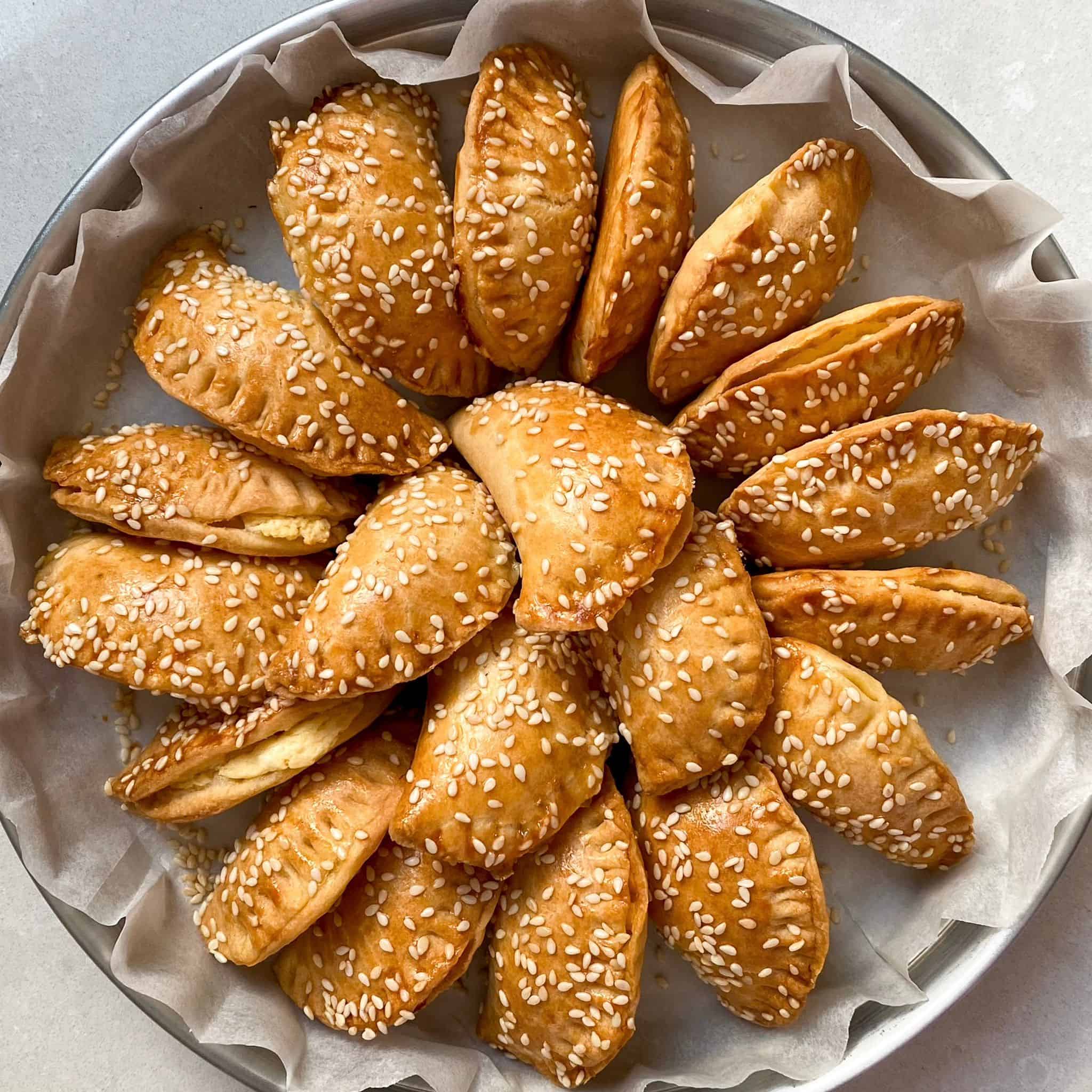 נעבוד עכשיו בזריזות, נמרח את הבוריקיטס שיצא קר מהמקרר בביצה, נפזר שומשום בנדיבות ונכניס לתנור למשך 25 דק׳ בדיוק.