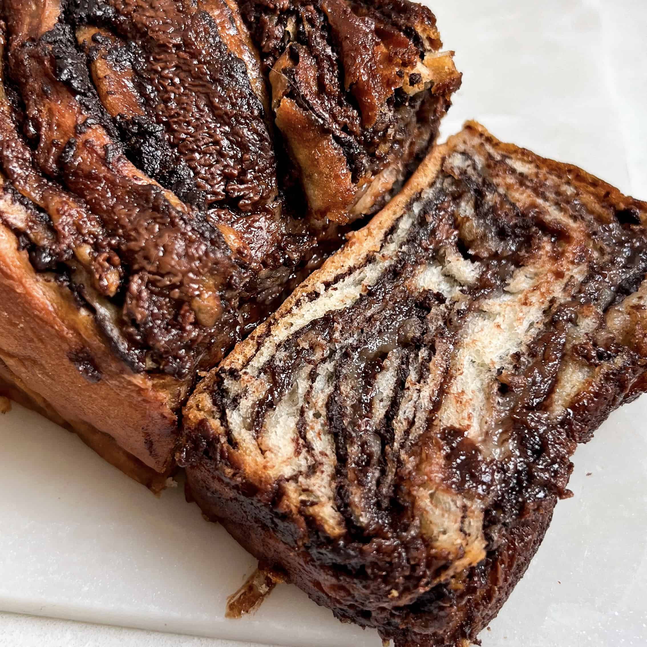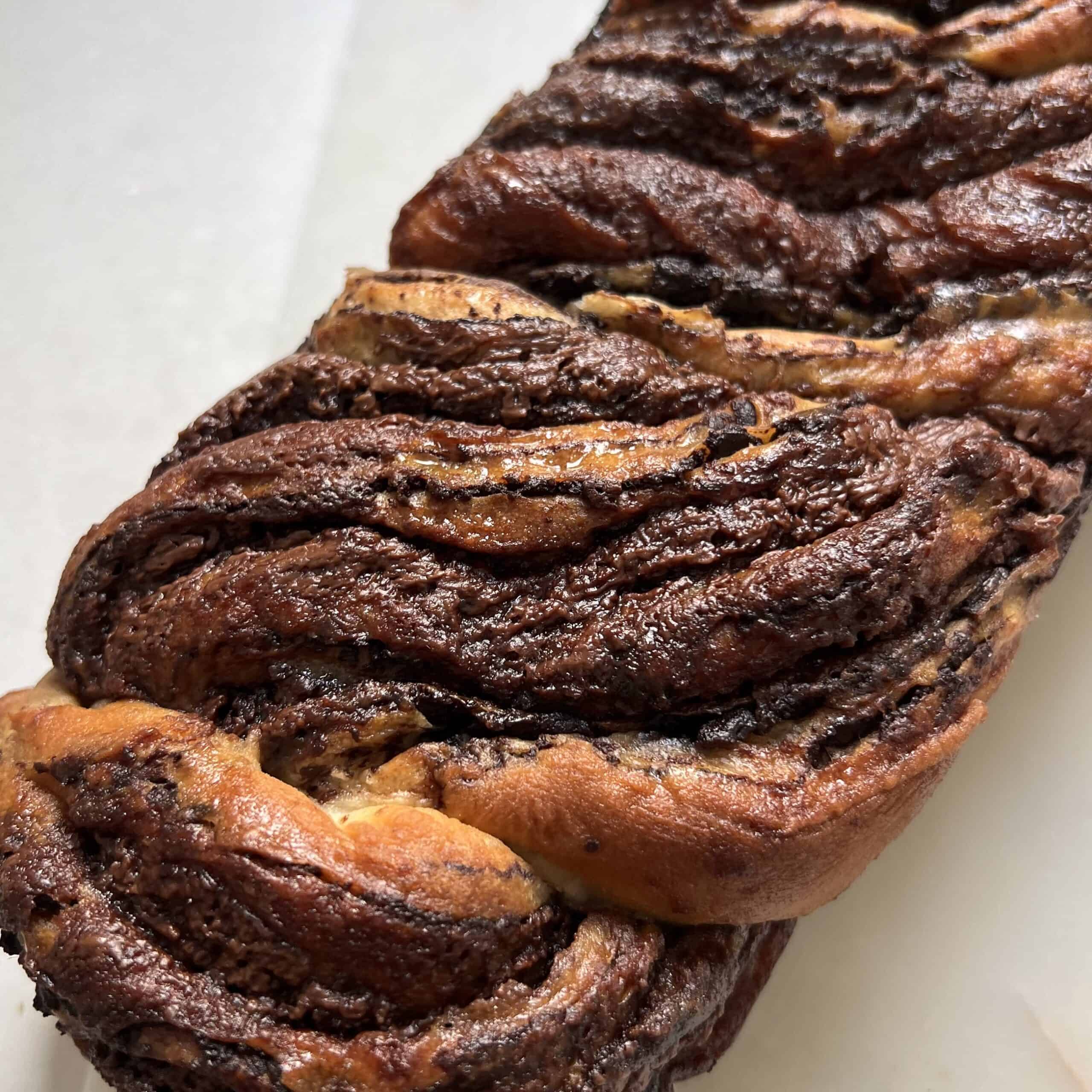 מורחים רבע צנצנת ממרח שוקולד באופן אחיד ומגלגלים לרולדה מהודקת.