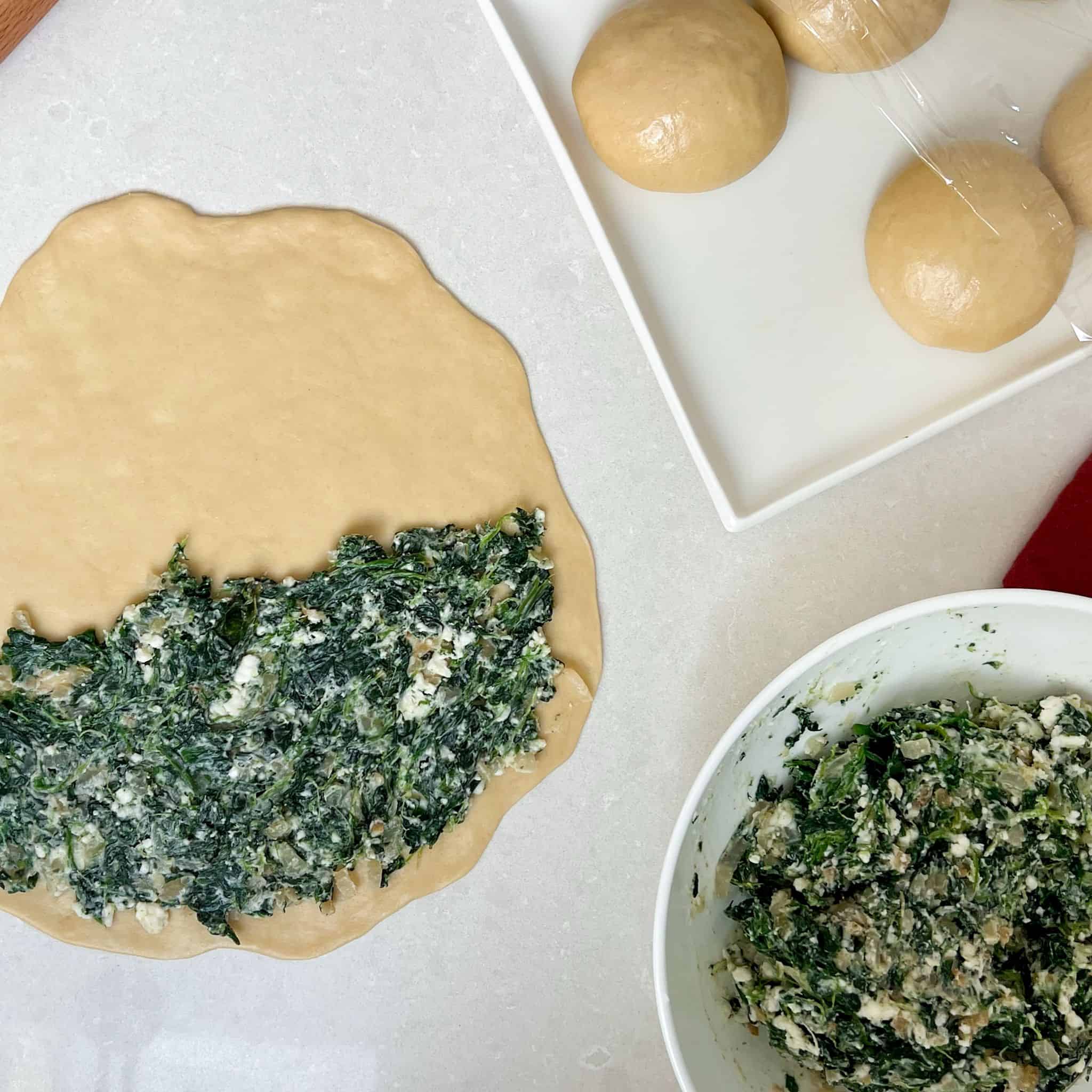 בעזרת מערוך מרדדים כדור בצק הכי דק שאפשר, ממלאים בכף גדושה של מילוי וסוגרים לחצי ירח – שימו לב הבצק צריך לצאת כמעט שקוף.