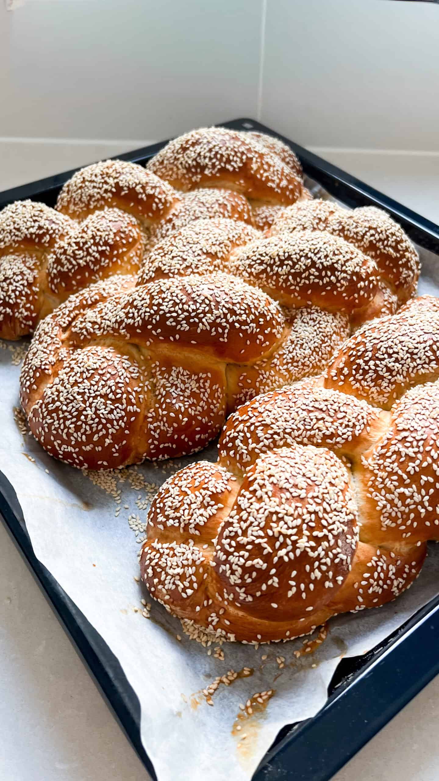לאחר שקיבלתם חלות ״רוקדות״ ושמנמנות, מורחים בביצה ומפזרים שומשום בנדיבות.