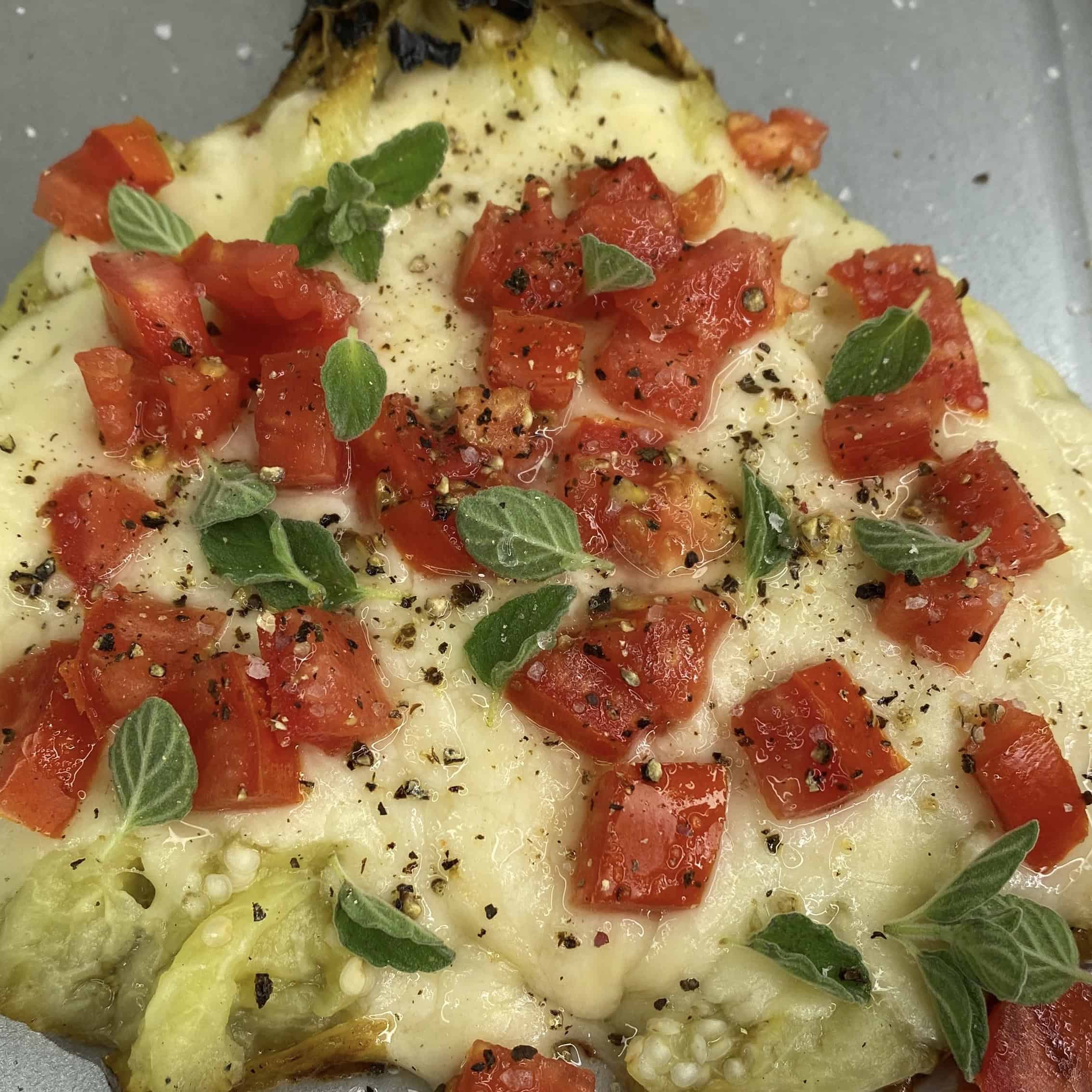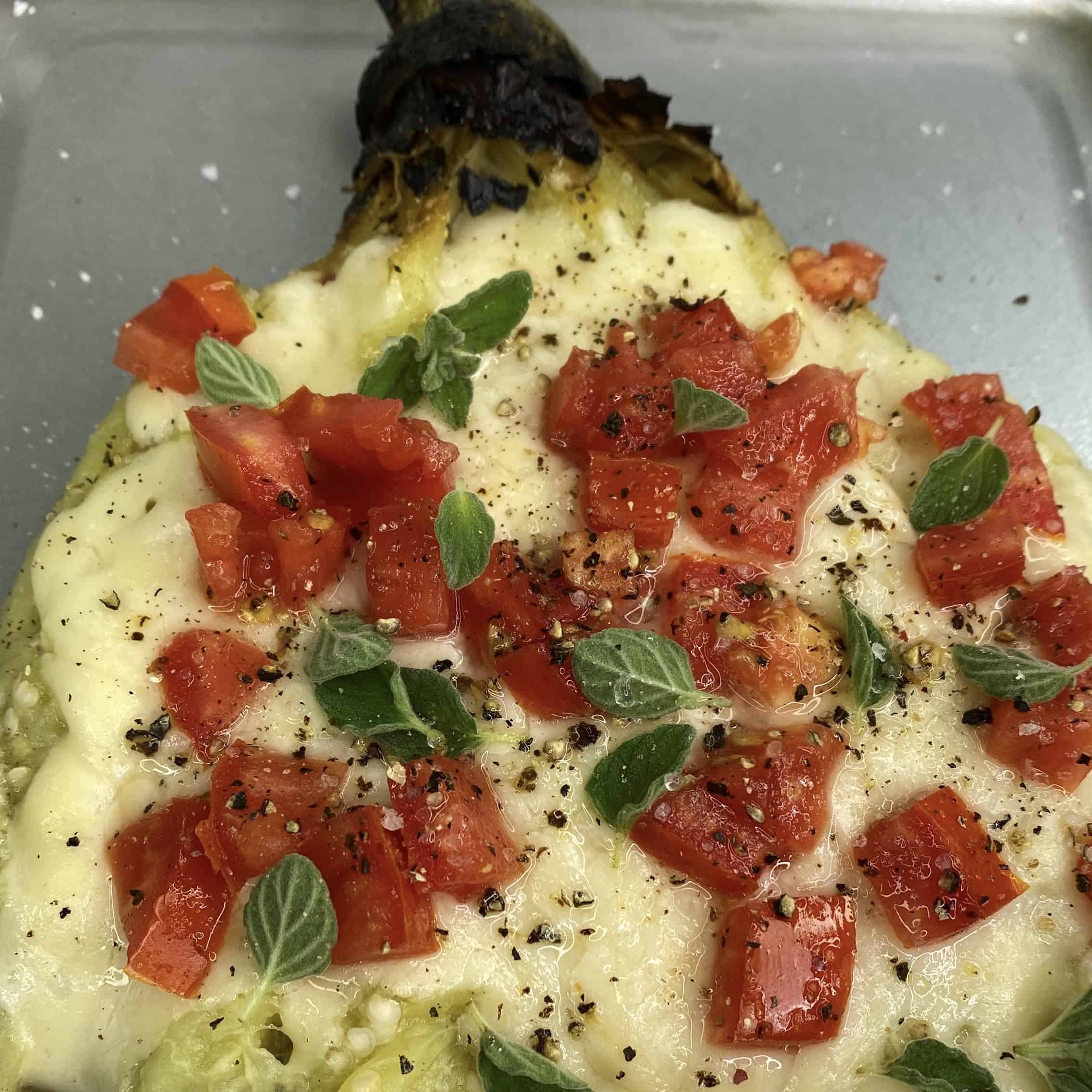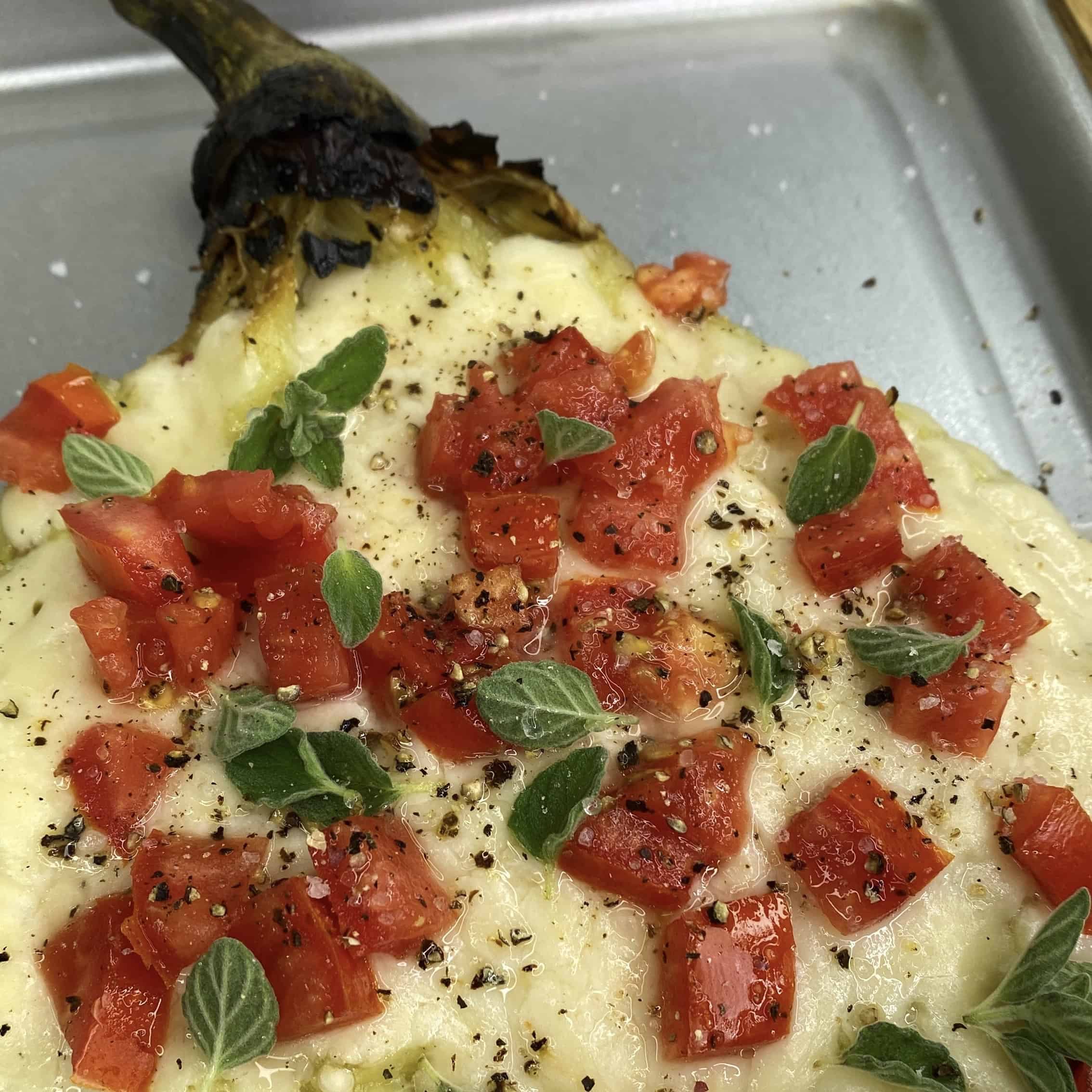 חצילים עם גבינות בסגנון בלקני טעימים בטירוף! חציל שרוף עם מוצרלה מוקרמת מעל שמגישים עם עגבניות קצוצות וזעתר טרי