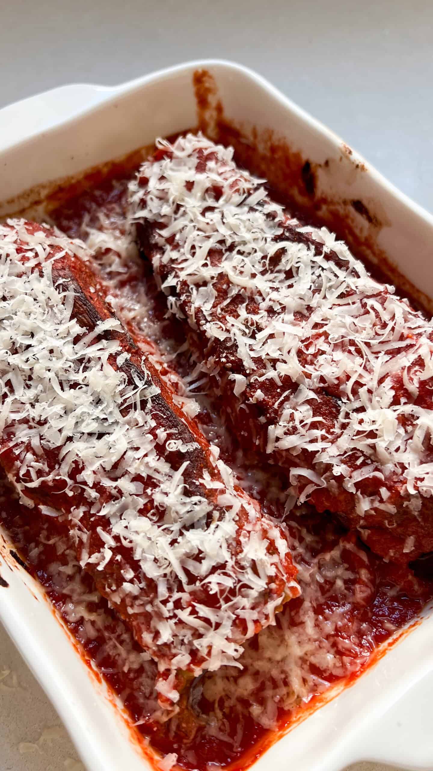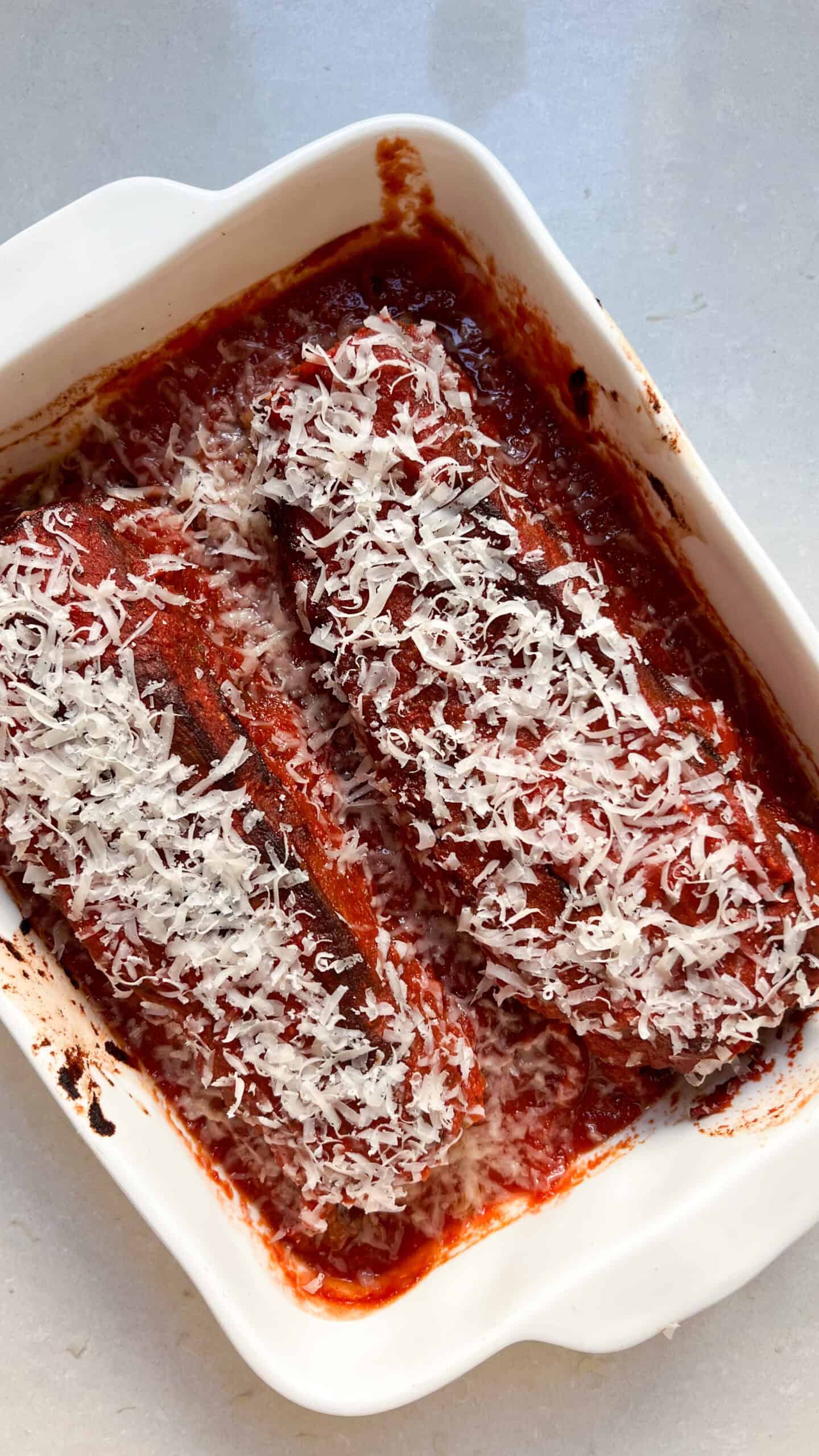 מיד כשיוצא מהתנור חותכים את ראש החציל, מגרדים פרמזן בנדיבות ומוכן.