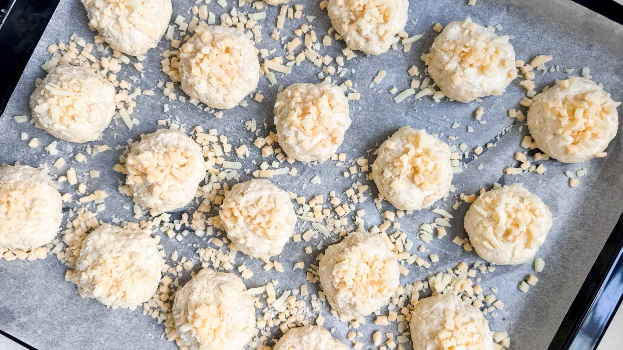 בעזרת ידיים רטובות מחלקים את הבצק ל-20 כדורים שווים ומניחים במגש מרופד נייר אפייה.