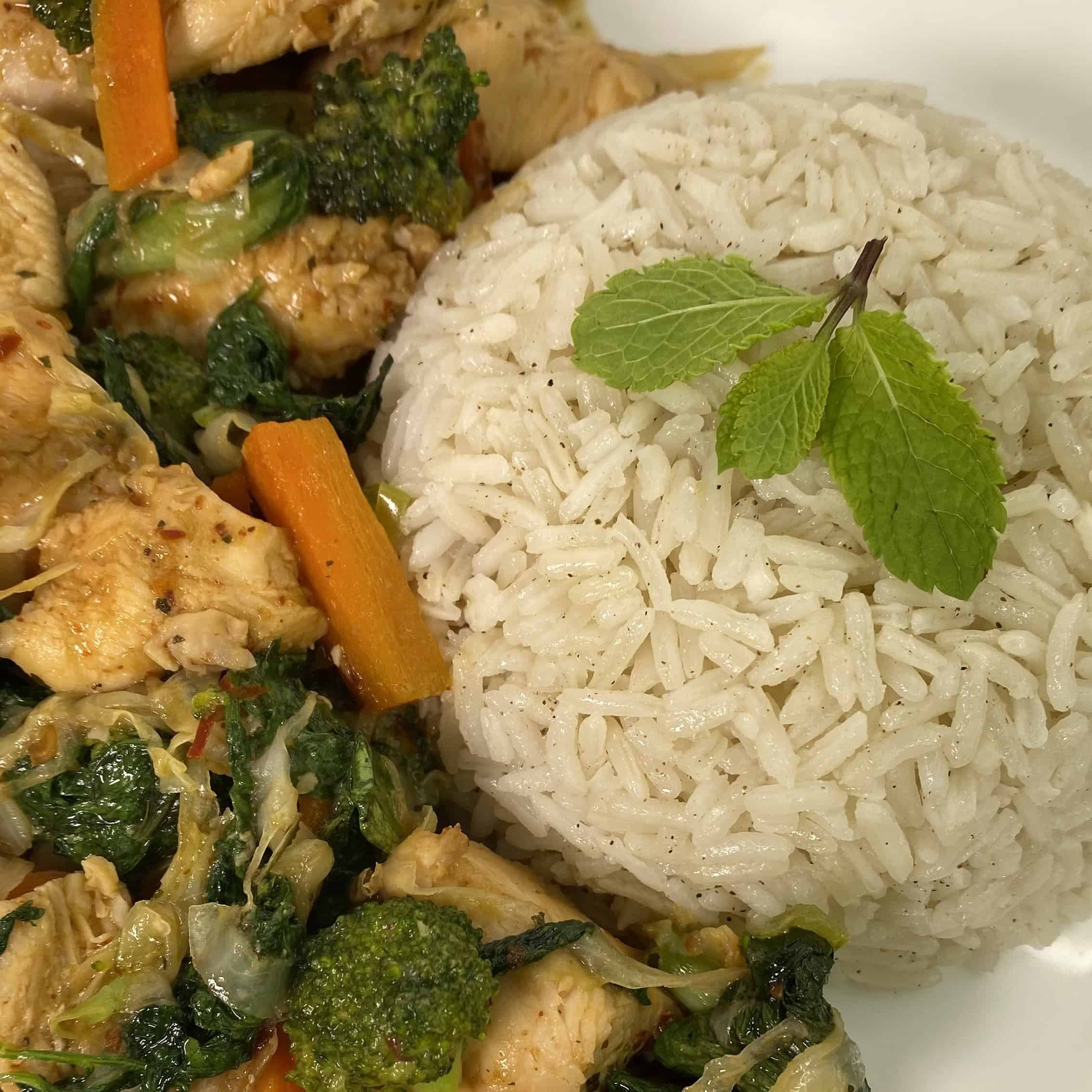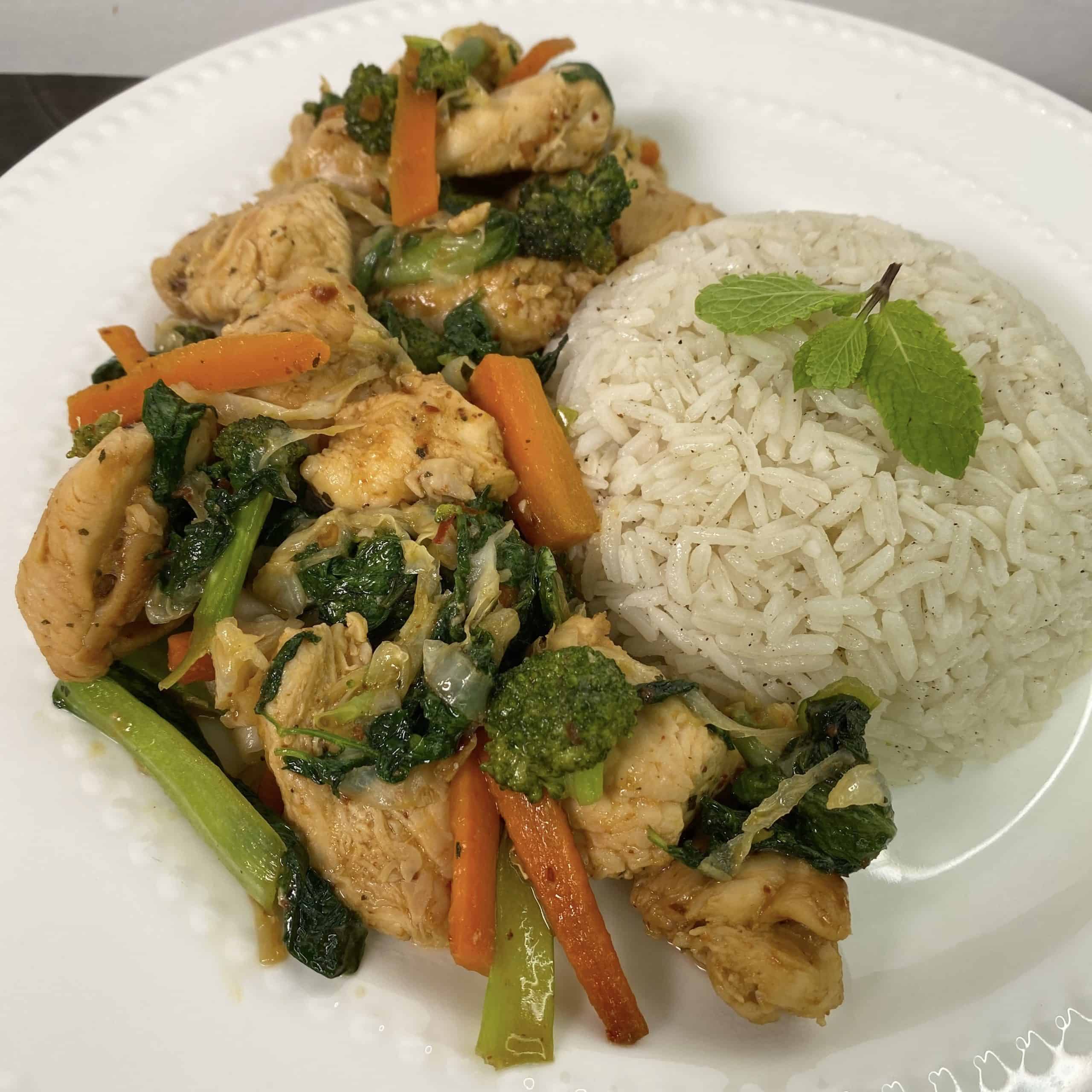 מוקפץ עוף וירקות בסגנון אסייתי שהכי כיף לאכול מעל אורז לבן - מנה מעולה לארוחת צהריים טעימה ברמות, בריאה ומשביעה