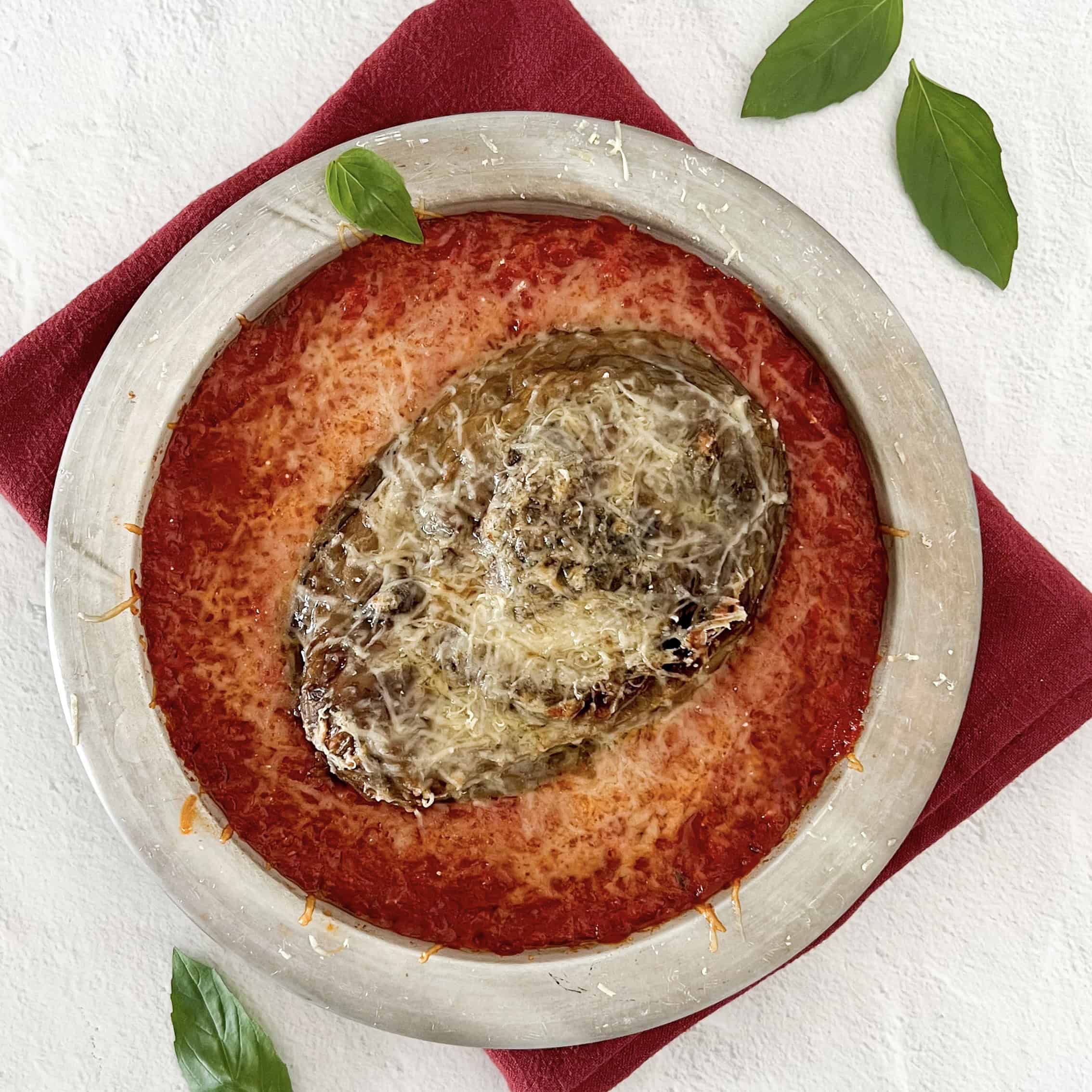 מחממים תנור ל-150 מעלות טורבו. מקלפים את החציל ומשאירים אותו שלם. במגש מרופד נייר אפייה מניחים את החציל ושופכים את השמן זית. בעזרת ידיים נקיות מספיגים את החצילים בשמן זית (לאט לאט הוא שותה את כל השמן) מפזרים מלח גס משני הצדדים, מניחים נייר אפייה לפי הדוגמה בסרטון על החציל ומכניסים לתנור למשך שעתיים וחצי. מוציאים מהתנור לצינון ובמקביל מכינים את הרוטב. בסיר מחממים שמן זית על אש נמוכה ומטגנים בעדינות את שיני השום. לאחר קבלת צבע זהוב לשום מוסיפים את שאר מרכיבי הרוטב ומערבבים היטב. ממשיכים בישול על אש נמוכה (בועות קטנות – לא סיר גועש!) למשך 45 דק׳ בהם נערבב מידי פעם. במקביל מחממים תנור ל-180 מעלות טורבו. מוציאים את הענפים של העשבי תיבול מהסיר ומעבירים את הרוטב למחבת המתאימה לתנור או תבנית קטנה. מניחים את הסטייק חציל במרכז ומגרדים פרמזן מעל. מכניסים לתנור למשך 15 דק׳ ומוכן! עוד טיפה פרמזן לפני ההגשה ובתאבון.