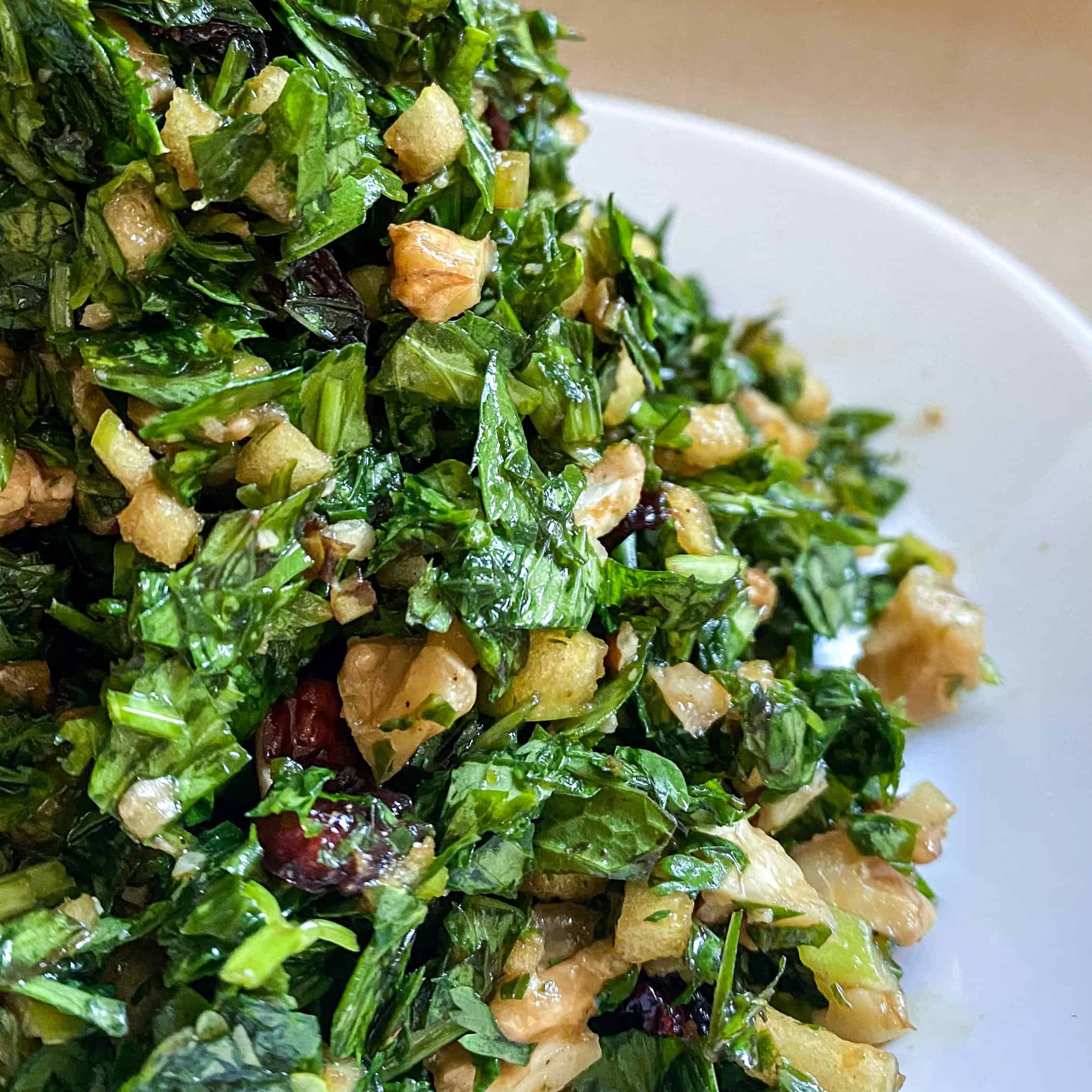 קוצצים את האגוזים גס ומניחים על הירוקים יחד עם החמוציות.