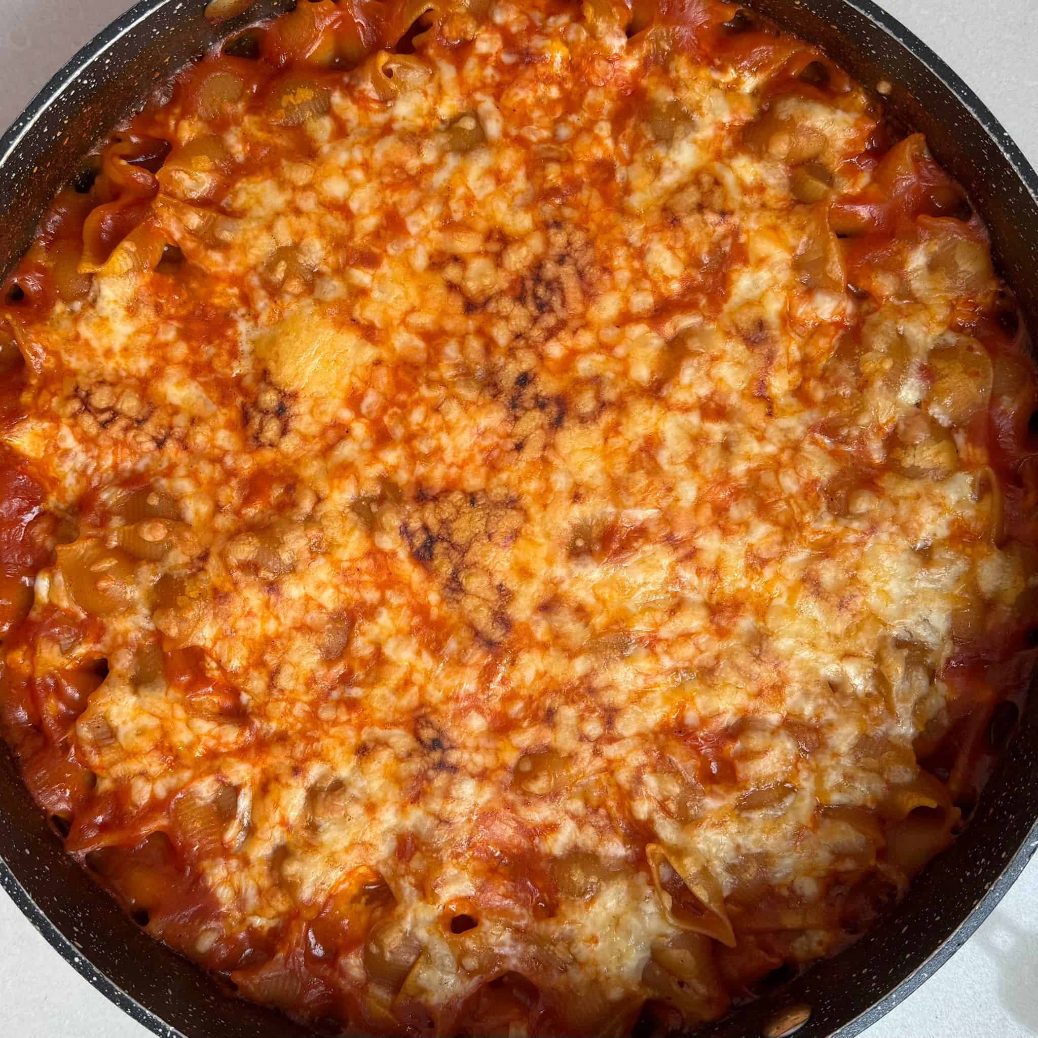 עכשיו מפזרים גבינה באחידות ומכניסים לתנור למשך 5-7 דק׳ ועד לקבלת צבע חרוך לגבינה.