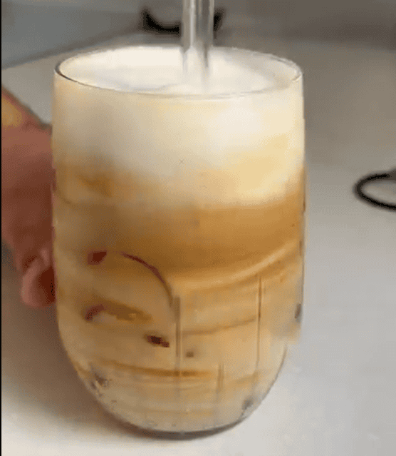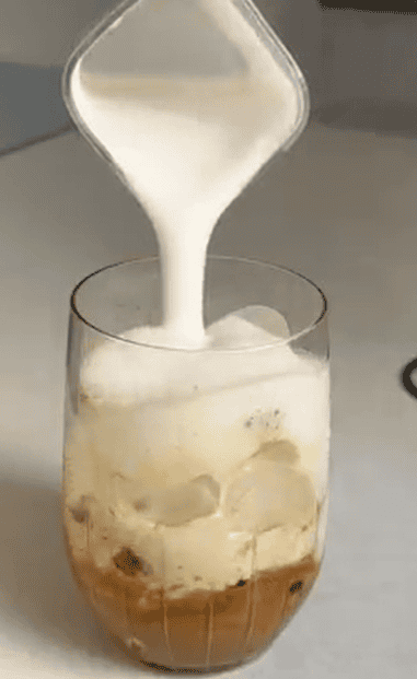 מוסיפים את הקרח לכוס ומיד את החלב המוקצף.